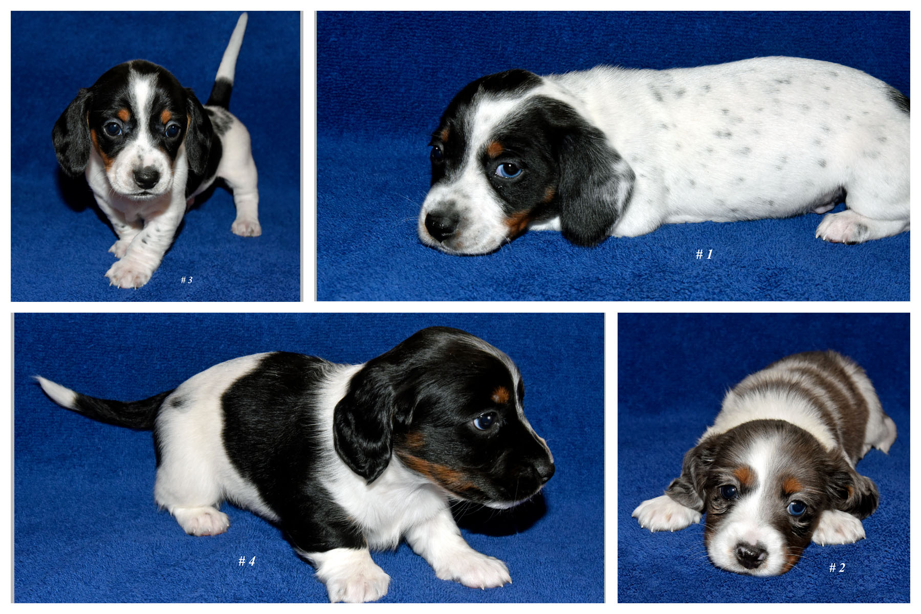 Angel & Cletus are the parents of this beautiful litter of 5 pups born 3-3-24. There are 3 black/tan & 1 black/tan reverse dapple males & 1 blue/tan reverse dapple female. The female is SOLD. This is a PRA clear litter and the parents are both Health Tested. The pups will come with full AKC/CKC registration and a 1 year written Health Guarantee. Each pup will carry chocolate/tan and any smooth hair pup will carry longhair. Any of these pups could carry cream & the ee gene. Any non dilute pup could carry dilute.